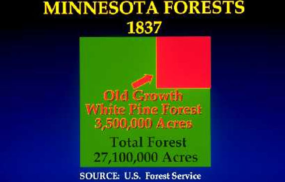 The green and red squares together represent Minnesota's 27 million acres of forests of all types before cutting began in 1837. The red square represents the three and a half million acres dominated by old growth white pine forest and mixed white and red pine forest.